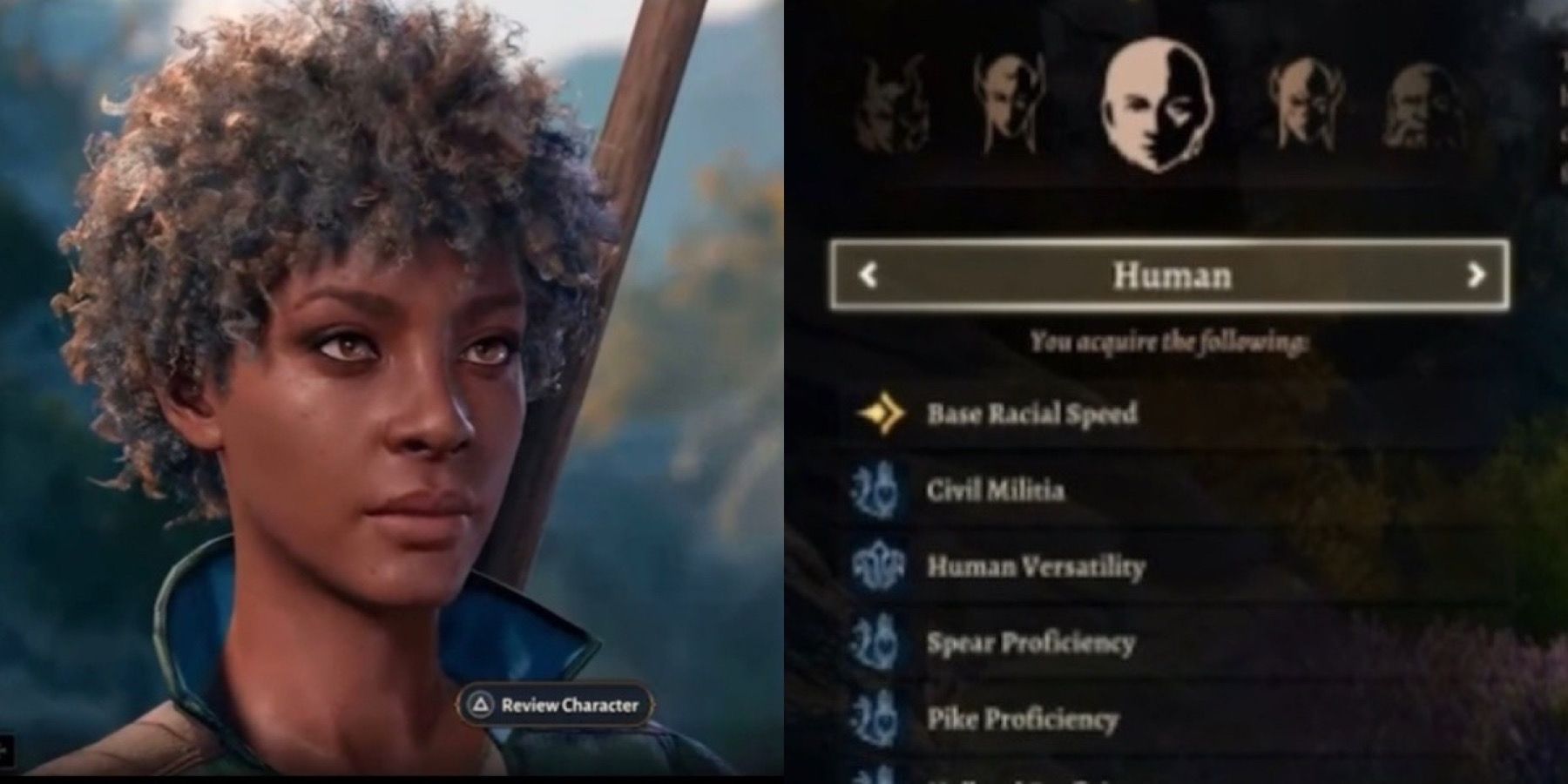 La race humaine n’a pas de sous-races, contrairement à de nombreuses autres races de Baldur’s Gate 3, mais c’est toujours l’une des races les plus polyvalentes à choisir dans le jeu. Comme la plupart des autres races, les humains ont un déplacement de 9 mètres, grâce à leur vitesse raciale de base. Ils bénéficient également de la Milice civile, qui leur accorde une maîtrise des armes avec les lances, les piques, les hallebardes et les glaives. Ils ont également une maîtrise des armures légères et des boucliers. Les humains ont également une polyvalence humaine, ce qui leur permet de gagner une compétence supplémentaire à maîtriser, ainsi qu’une augmentation d’un quart de leur capacité de transport.