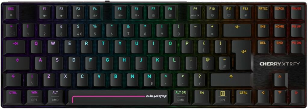 Cherry XTRFY combine l'expertise allemande de Cherry avec le design suédois de XTRFY. Le boîtier en aluminium brossé est rigide et élégant. Le format TKL sans fil libère de l'espace bureau. Les keycaps PBT doubleshot Cherry Profile sont parmi les meilleurs du marché — profil ergonomique, légendes durables et texture agréable. Les switches Cherry MK Crystal offrent une frappe smooth avec un son agréable. La plaque en aluminium et les joints gasket assurent un son de frappe profond et mat. Le poids est notable à cause de la batterie 8 000 mAh, mais le clavier reste stable sur le bureau. L'éclairage RGB per-key est lumineux et les légendes translucides.