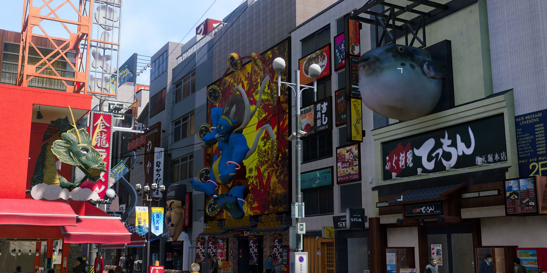 Pour capturer ces êtres dans une seule photographie, Joryu doit se positionner stratégiquement. L’endroit idéal pour cette tâche se trouve à une courte distance à l’ouest du Shot Bar Stilj, au coin de la rue W Sotenbori et près du coin du palatial Cabaret Grand. Ici, Joryu devrait se retourner pour faire face à Stilj, où il verra les trois êtres : un dragon au-dessus de Kinryu Ramen, un poisson-globe au-dessus d’un restaurant voisin, et le dieu du tonnerre au-dessus de Sunrise.