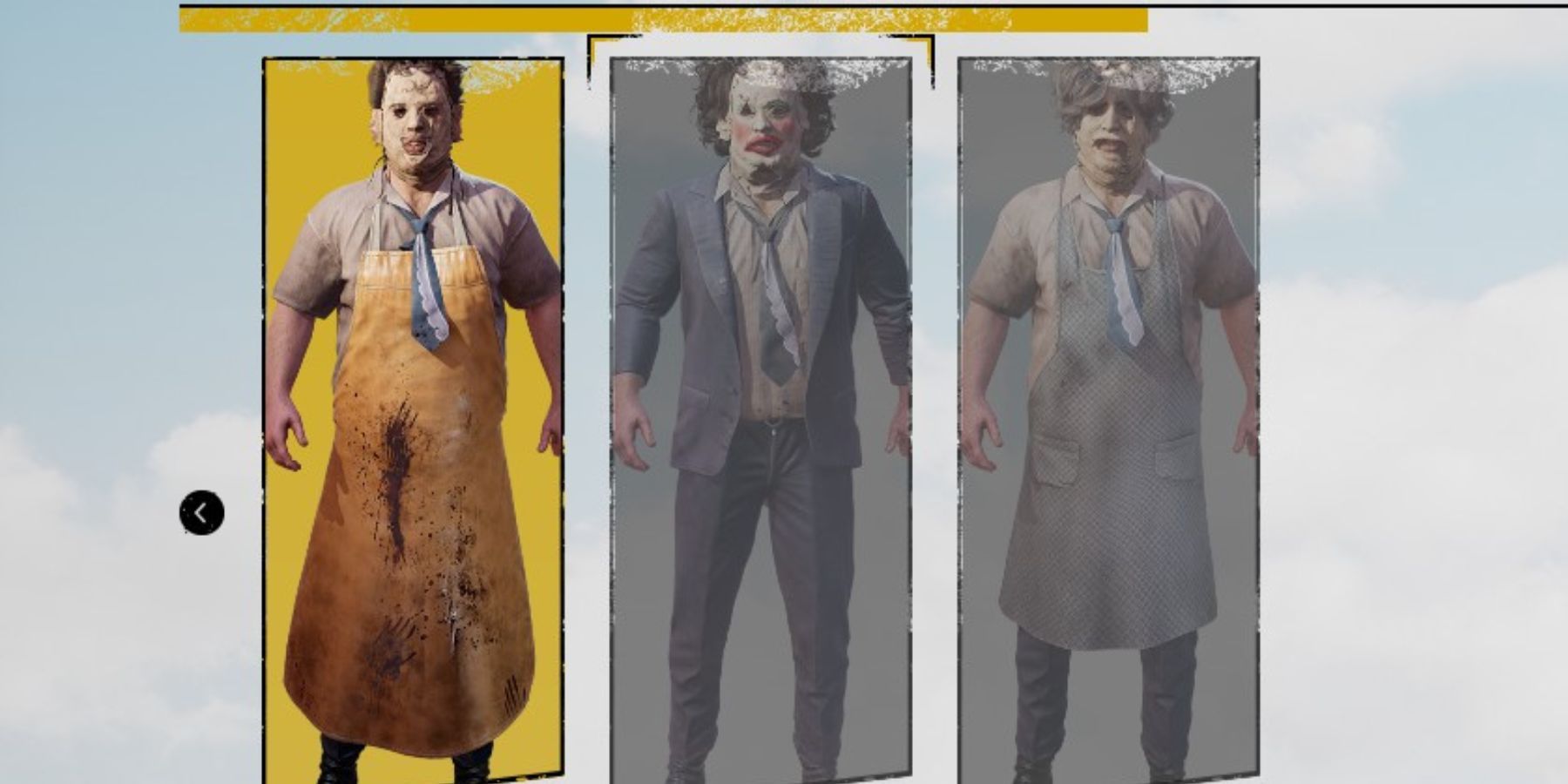 Leatherface dispose de trois options supplémentaires que les joueurs doivent télécharger en tant que DLC s’ils souhaitent changer l’apparence de sa tronçonneuse, dont Rusty, Memento et Pristine. Les skins de tronçonneuse sont gratuits, même s’ils sont considérés comme des DLC. Les joueurs peuvent débloquer sa skin Pretty Woman en le jouant 10 fois et sa skin Old Lady en le jouant 20 fois. Certains joueurs ont signalé un bug qui empêche les skins de se débloquer même lorsque les exigences sont remplies. Les joueurs devront participer à de nombreux matchs s’ils souhaitent débloquer toutes les tenues disponibles dans The Texas Chain Saw Massacre. Chaque match doit être terminé, car se déconnecter avant la fin d’un match ne compte pas pour le déblocage d’un skin en jeu.