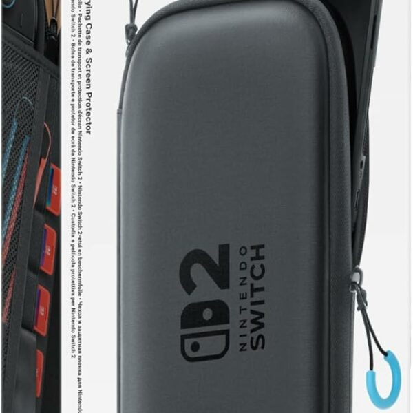 La Pochette All-In-One Nintendo Switch 2 est l'étui de transport grand format officiel Nintendo, conçu pour accueillir non seulement la console mais aussi tous ses accessoires essentiels. Contrairement à la pochette standard qui ne contient que la console, le modèle All-In-One offre un compartiment dédié pour le chargeur 45W, un slot pour le Pro Controller ou une paire de Joy-Con supplémentaire, et un rangement pour 20 cartouches de jeu. C'est la solution de transport tout-en-un pour les joueurs nomades qui veulent tout avoir à portée de main. La coque rigide offre une protection supérieure à la pochette standard avec une résistance aux chocs et à l'eau (éclaboussures) améliorée. Le format plus large est un compromis assumé : plus de protection et de rangement contre un encombrement accru. Idéale pour les voyages ou les sessions gaming chez des amis.